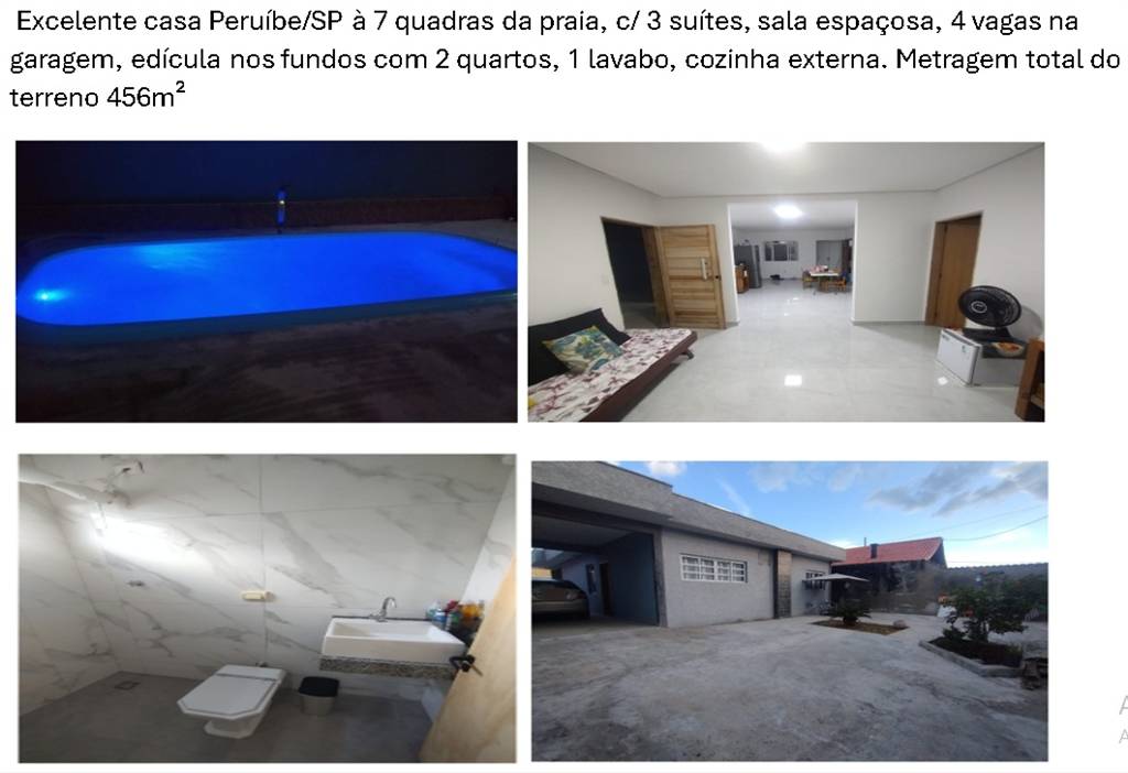 Excelente casa recém reformada c/ piso porcelanato, teto moderno rebaixado, gesso nas paredes, á 700mts da praia na cidade de Peruíbe/SP.. 3 suítes, cozinha americana, vaga p/ 4 carros na garagem. Piscina e churrasqueira + edícula nos fundos c/ 2 quartos, 1 banheiro, cozinha externa. Área útil da casa principal 175m². Documentação ok, aceita financiamento bancário.